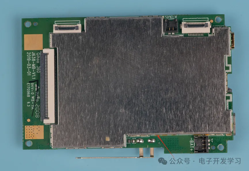 回到主板部分,拆掉主板之后,可以看到有一个黑色的绝缘贴纸,贴纸下面就是外壳爆裂的罪魁祸首——锂电池。