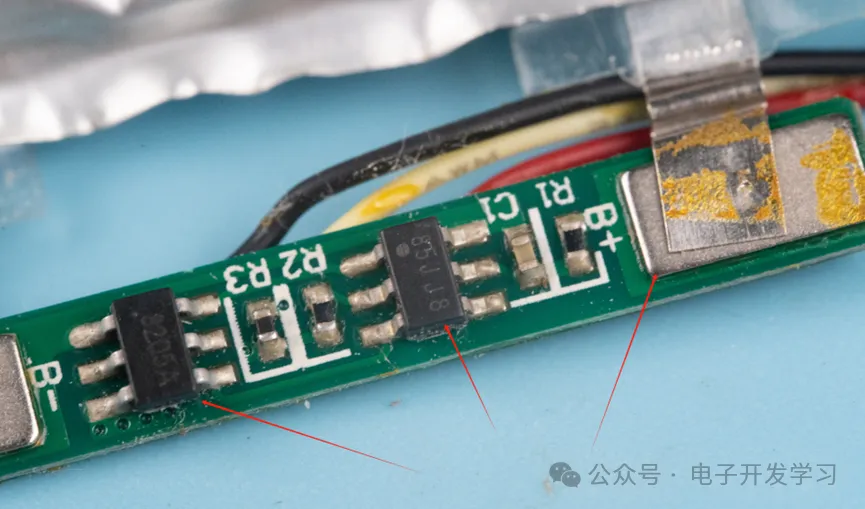 锂电池保护板上有两个芯片,分别是MOS管8205A和丝印85JJ8的锂电池保护芯片。另外。可以看到这个锂电池保护板在SMT的时候,贴了小镍片,这样后期可以直接把电池的电极片点焊到这个小镍片上。
