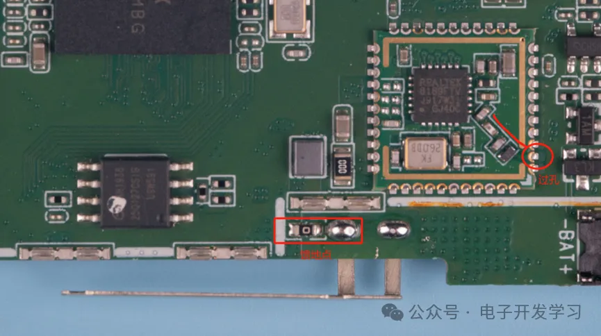 回到正面可以看到模组的天线信号引出之后到底板上确实通过过孔走到板子背面了。另外,板子正面也有一个0欧姆电阻连接天线的馈地点到地平面。
