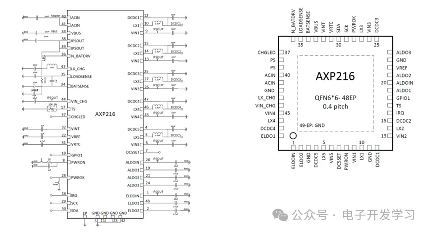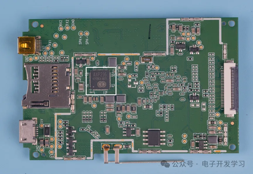 板子背面白色框中的芯片AXP216是一颗PMIC,其实从周围的三个电感也可以看出来。