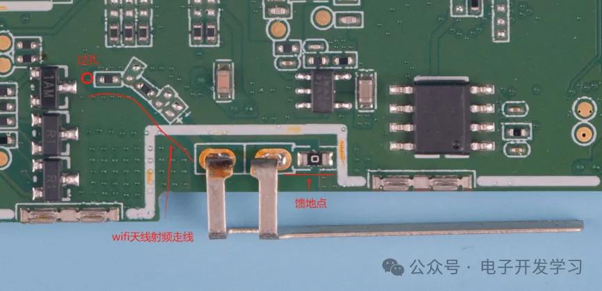 板子边缘的这个金属片,是wifi模组的天线。看起来它的射频信号来自于板子正面。