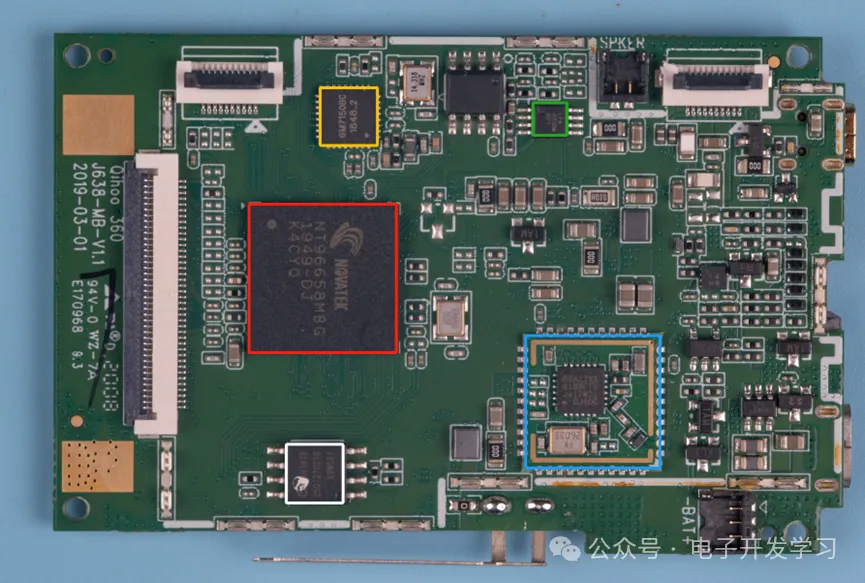 拆掉屏蔽壳,图中红色框的图像处理芯片是联咏的NT96658。蓝色框中的是一个wifi模组,上面的芯片是瑞昱的RTL8189FTV。黄色框中的视频输入预处理芯片是成都振芯的GM7150BC。绿色框中的是微源的LPA4890MSF,这是一颗1.2W的Mono 音频功放。白色框中的SOP-8封装的器件,是兆易创新的GD25Q127CSIGR,128Mbit的NOR Flash。