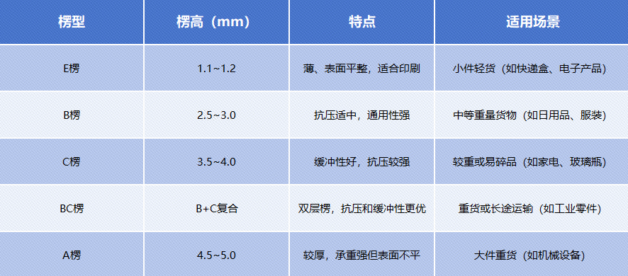 短途运输/快递:选用B楞或E楞(轻量化设计,降低成本)。