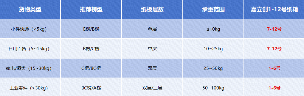 ≤5kg:E楞或B楞(单层瓦楞),常见如日常快递纸盒,轻巧便捷且能满足基础防护需求。