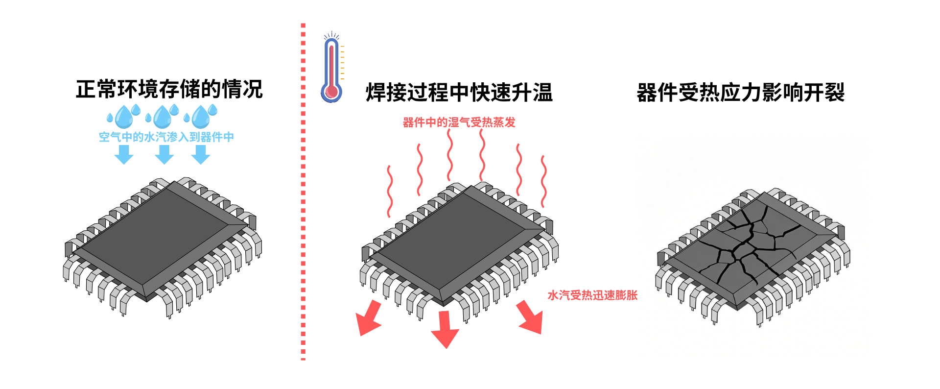 贴片器件大多采用的是塑料封装(如环氧树脂),这些材质因其特殊的分子结构而具有一定的吸湿性,当在非干燥环境存储或暴露时,会吸收空气中的水分并渗透进器件内部。