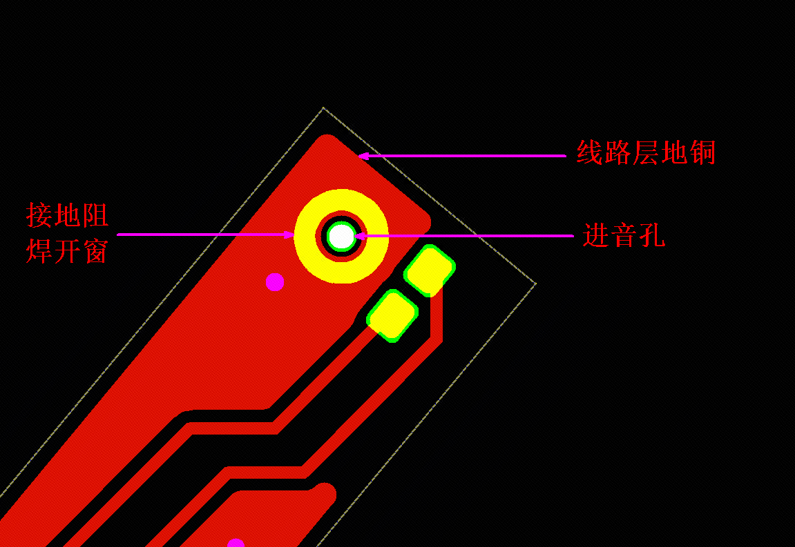 硅麦进音孔周围位置需设计环形阻焊开窗,方便硅麦接地,消除噪音。