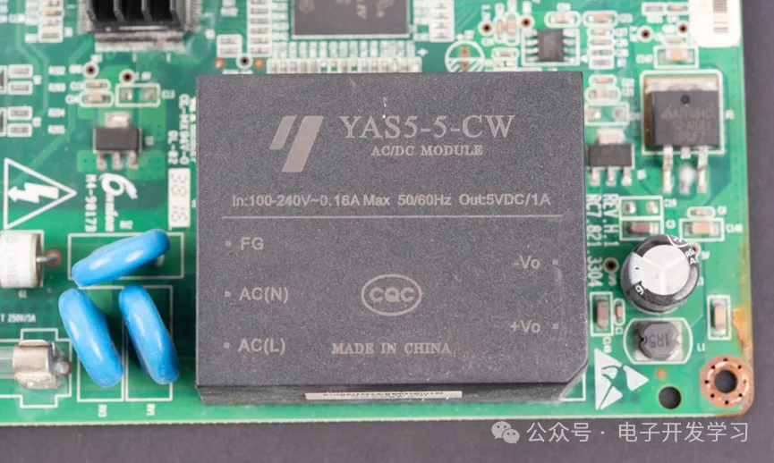 压敏电阻之后,就是一个尺寸超级大的AC-DC隔离电源模块,这个模块的型号是YAS5-5-CW,这个模块的输入是100-240V,输出是5V1A。为什么体积这么大,主要还是因为它是个隔离电源模块。