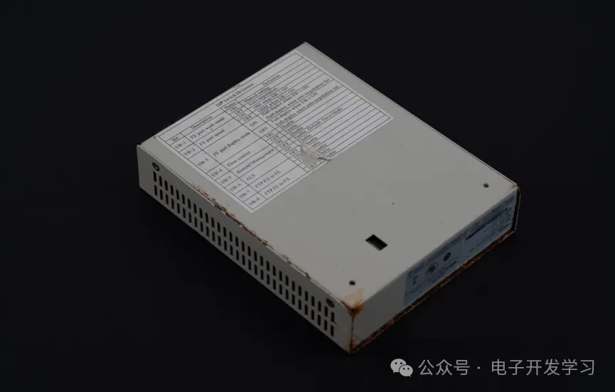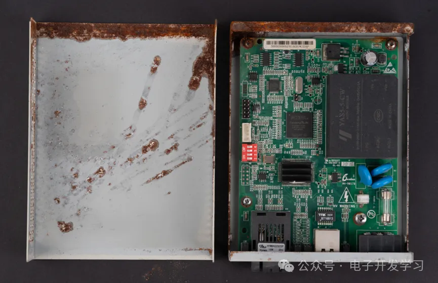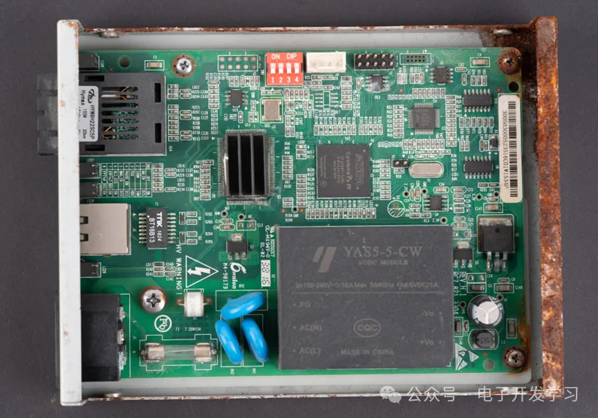 拆解,发现钣金外壳底部锈蚀严重。看生产周期,这个板子是16年38周制板的,距离现在八年了。八年了,知道这八年,这个光纤收发器是怎么过的吗?