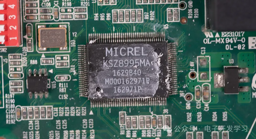 用热风枪吹一吹,取掉散热器。这个器件的型号是KSZ8995MA,是一颗5端口的10/100BASE交换机IC。旁边有一颗25.0006MHz有源晶振。