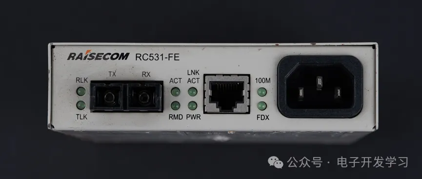 看logo,来自RAISECOM(瑞斯康达),型号是RC531-FE,是一台光纤收发器。两个光纤接口,一个是TX,一个是RX。中间是一个100M的以太网接口,右边是交流电源接口。除了这些接口之外,还有8个状态指示LED。