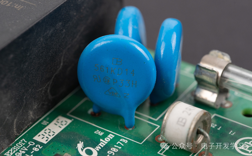 玻璃保险丝和GDT之后,是三个君耀电子的压敏电阻(MOV),型号是561KD14。