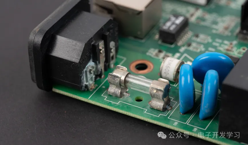 电源进来之后,零线上串联了一个一次性玻璃保险丝。