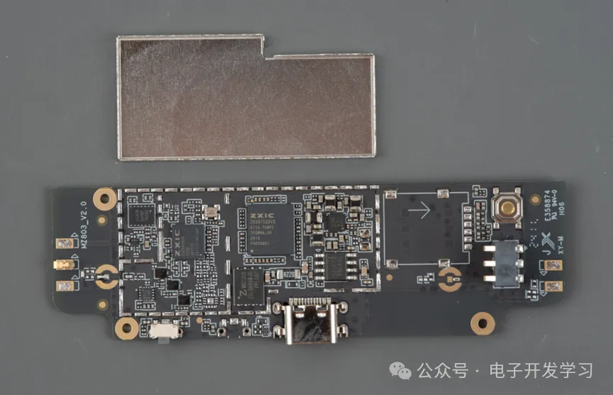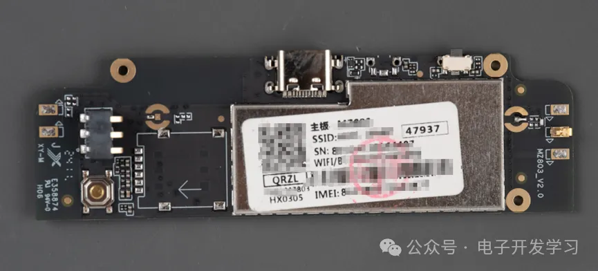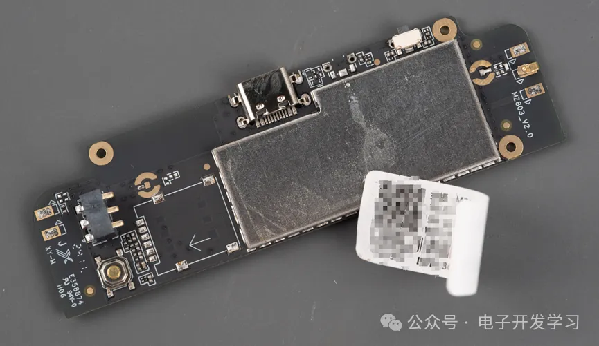 板子背面是rst按键、电池连接器、天线弹片等等,主要的电路在屏蔽壳下面。