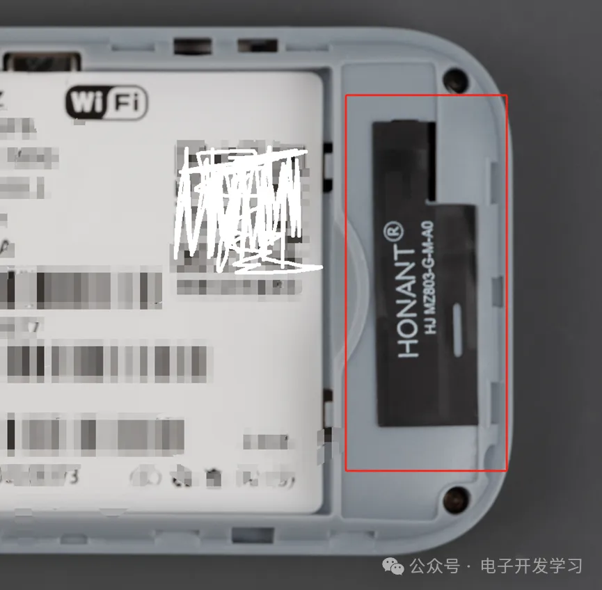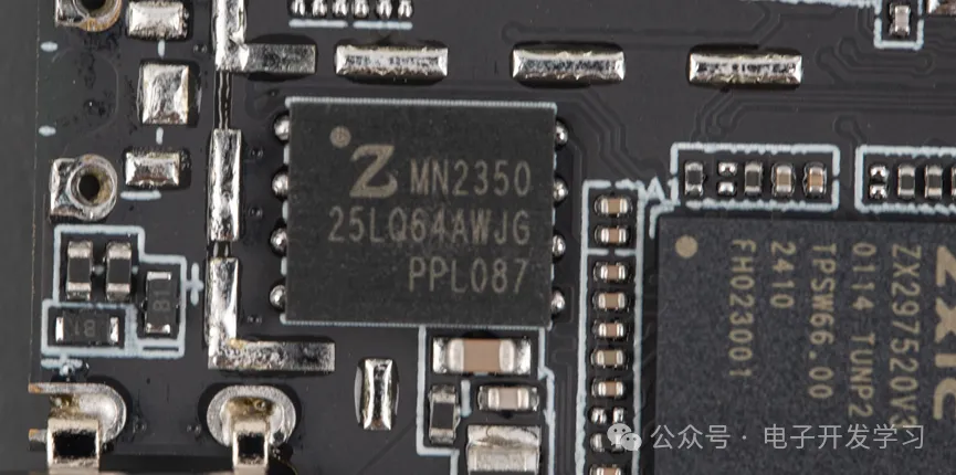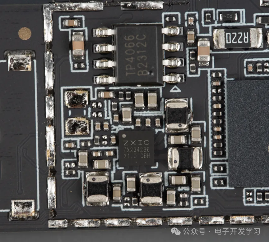 同样来自中兴微电子的ZX234296是PMIC电源管理芯片。外围放了四个电感,看来有4路BUCK输出。附近的这颗TP4056是锂电池充电芯片,这个芯片最大充电电流1A,所以用5V2A充电器也达不到10W的充电功率。我看到其他的随身wifi有些用的是带路径管理的锂电池充电管理芯片,而TP4056显然是不支持路径管理的低成本方案了。