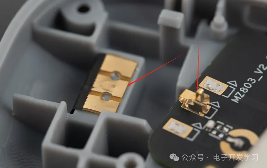 天线引出到板子边缘之后。通过天线弹片和软天线的触点接触。