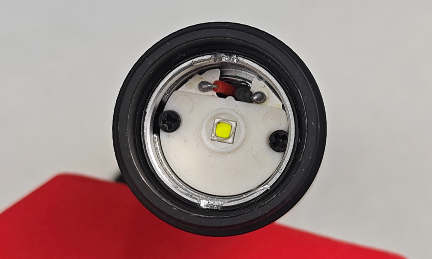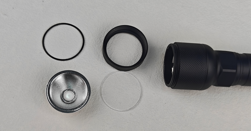 那就让它发挥一下余热,作为拆解的素材吧。头部很容易拧下来,顺便把镜片和反光杯、O型密封圈拿下来。