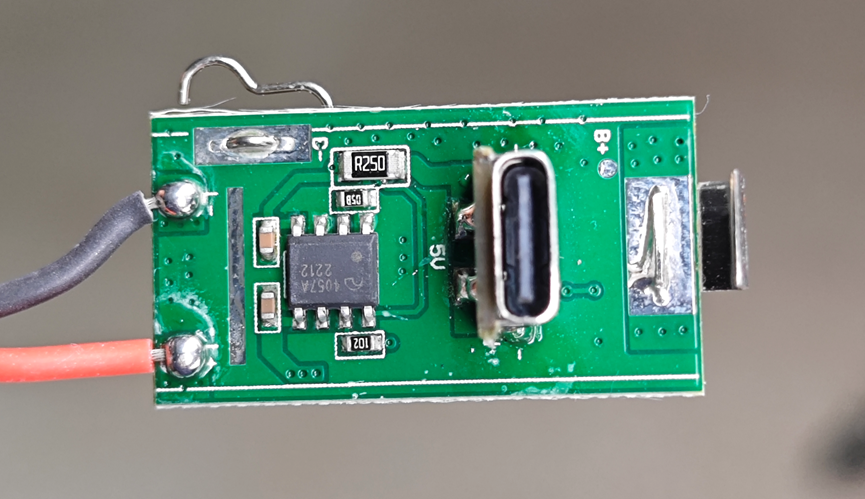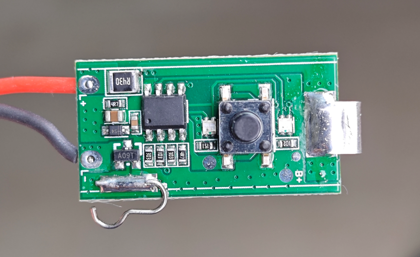 板子正面是一个SOP-8封装的芯片,正面没有丝印,不能确定具体型号,但是大概率和之前拆过的一些低成本手电筒用的是大同小异的方案。按键两侧有两个双色贴片LED,用来显示电量什么的。