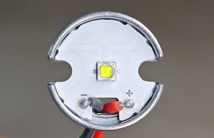 这个灯珠肚子上应该是三个焊盘,中间的焊盘是用来散热的。所有链接出来有个大铜皮,但是没有接到电源和地。灯板是铝基板,贴在一个铝合金材质的散热件上,然后由这个铝合金材质的散热件把灯板的热量传导到外壳上。