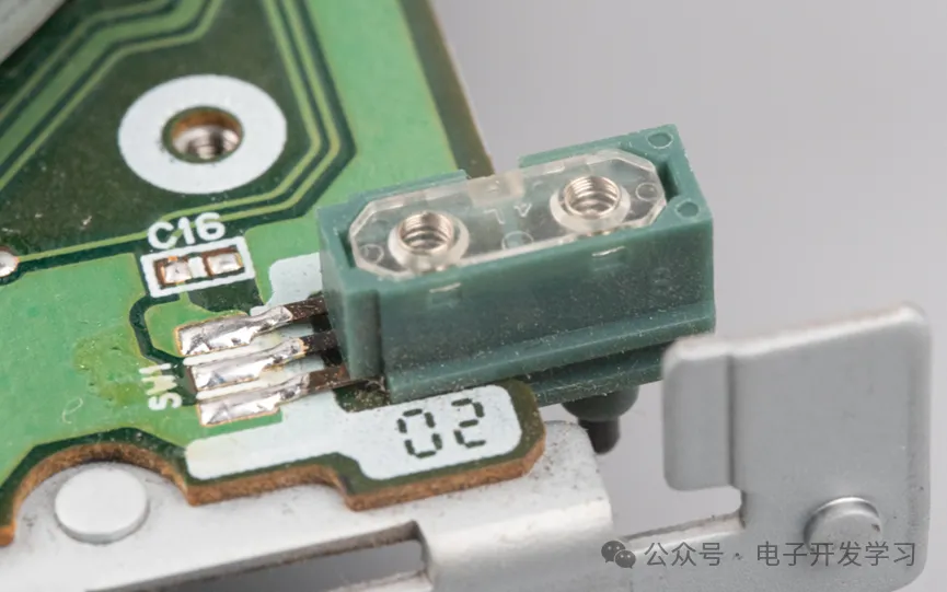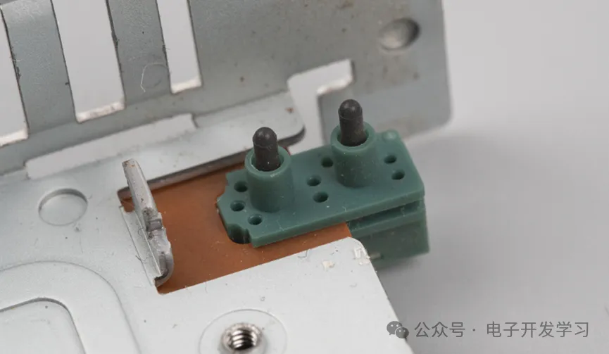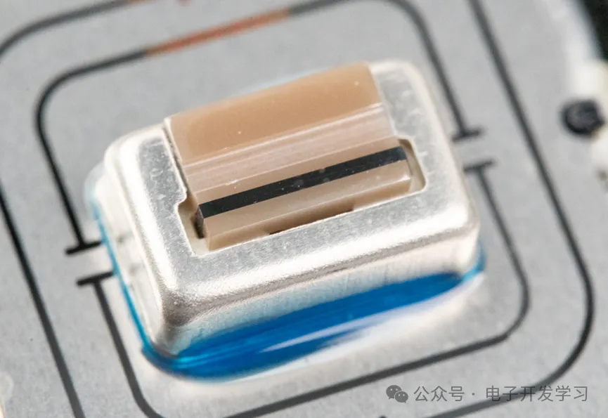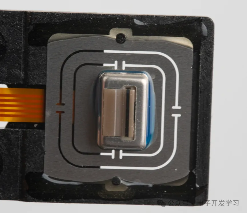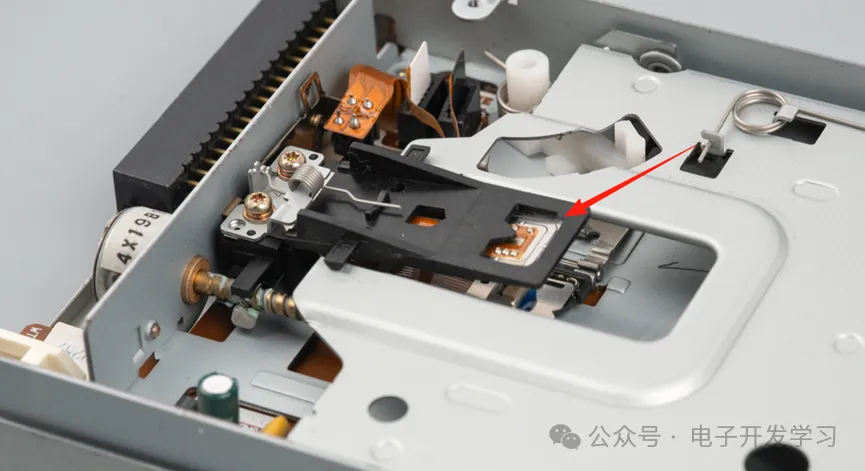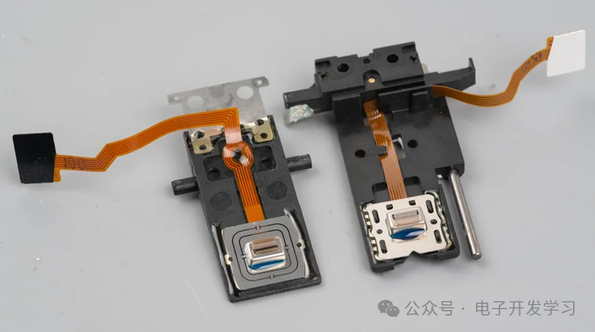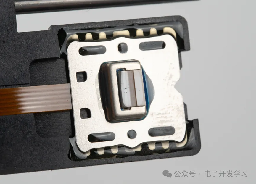 这个读写头是固定在一个很薄的钢片上的。然后读写头四周开了两圈槽,我怀疑这个设计是为了降低电机转动时产生的振动对读写头的影响。很多飞控设计的时候,为了降低电机对飞控MEMS姿态传感器的影响,会把姿态传感器周围也挖这种槽,除了降低振动,还可以放一个加热电阻来让传感器保持恒温。