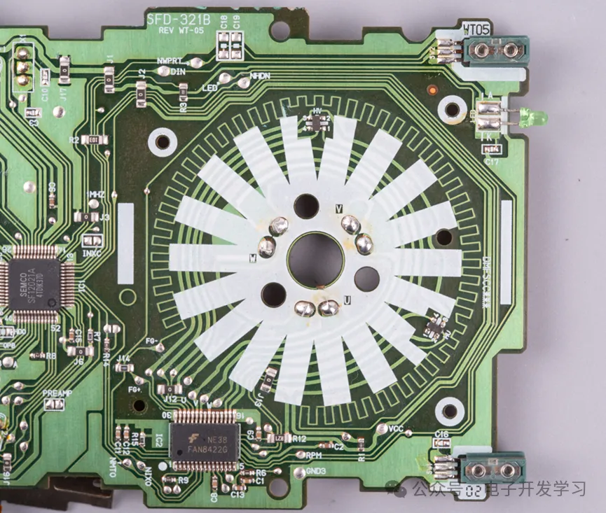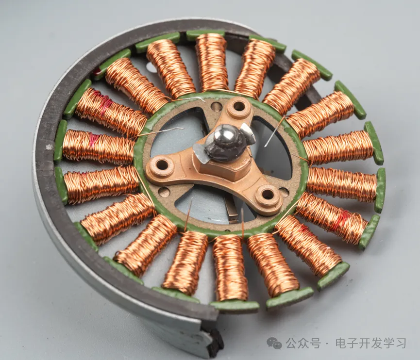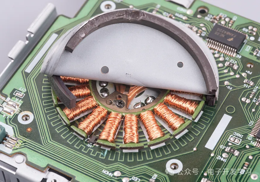 这个电机可太难拆解了,顶部的螺丝根本拧不动,只能暴力掀起它的盖头来。里面的绕线看着很不整齐,赶紧像是手工绕线,不是机器绕的。绕组外面的PCB上还有一圈矩形齿状走线,不知道这个是干嘛的,难道是编码器吗?
