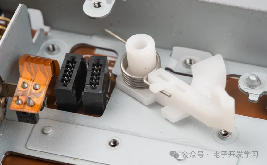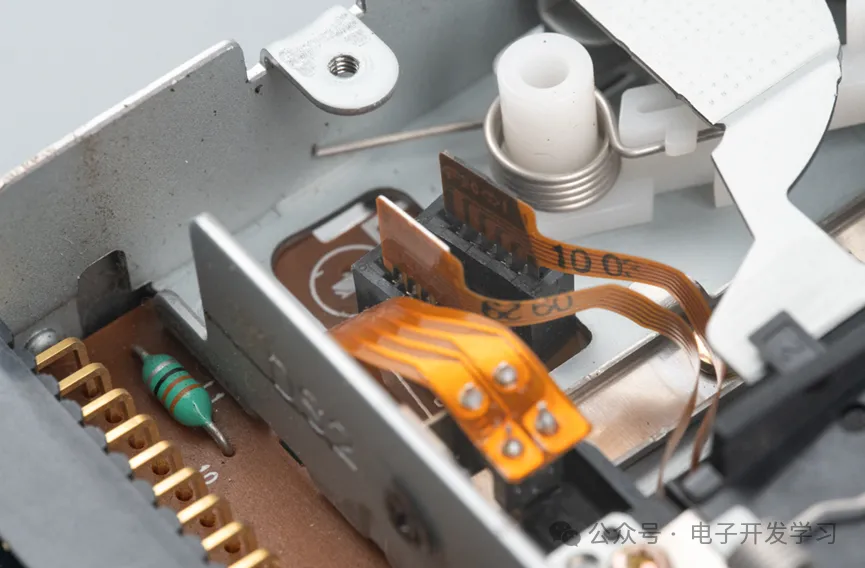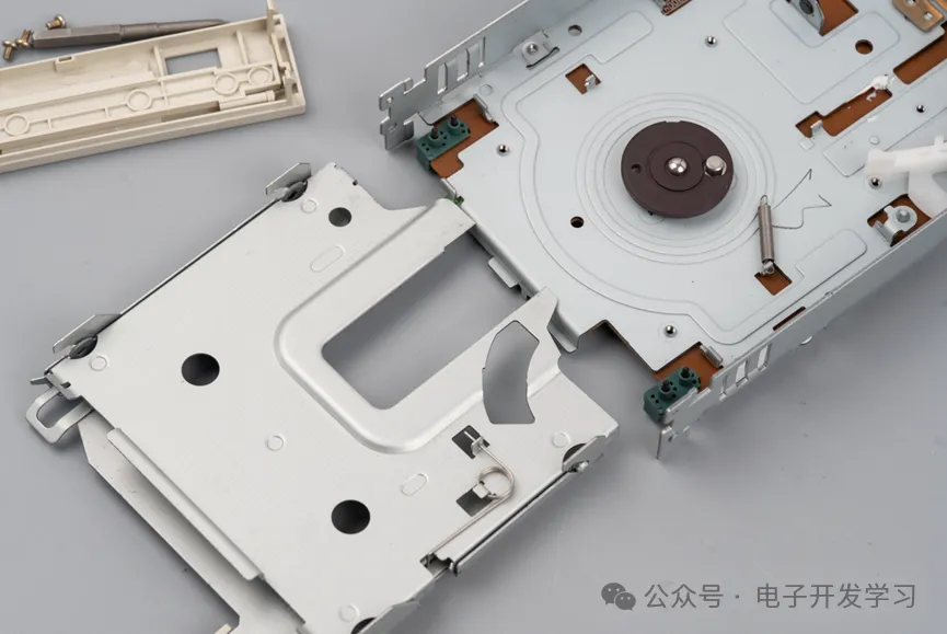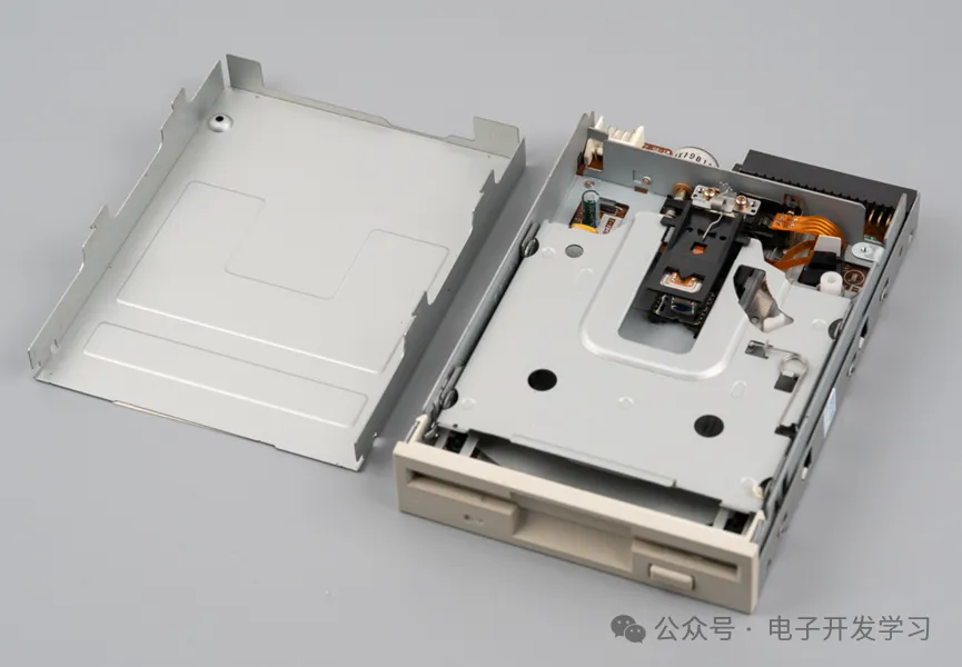 整个软盘用的是这种冲压壳体。拆开顶壳,发现结构不是很复杂。