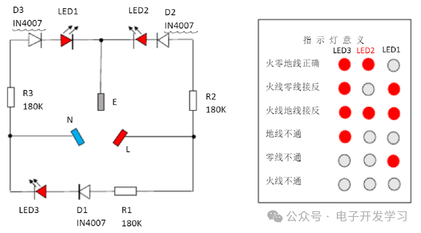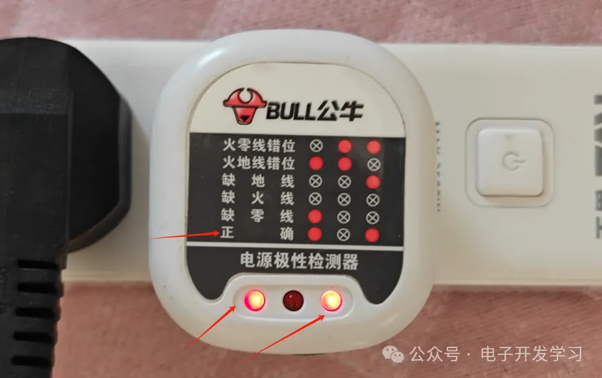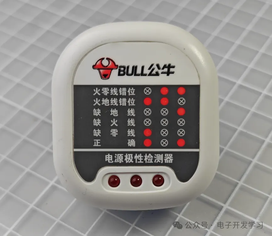 检测的时候直接把这个检测仪插到需要检测的插座上面,然后看上面的LED亮灭的组合,根据这个组合就能知道插座内部接线是什么问题。