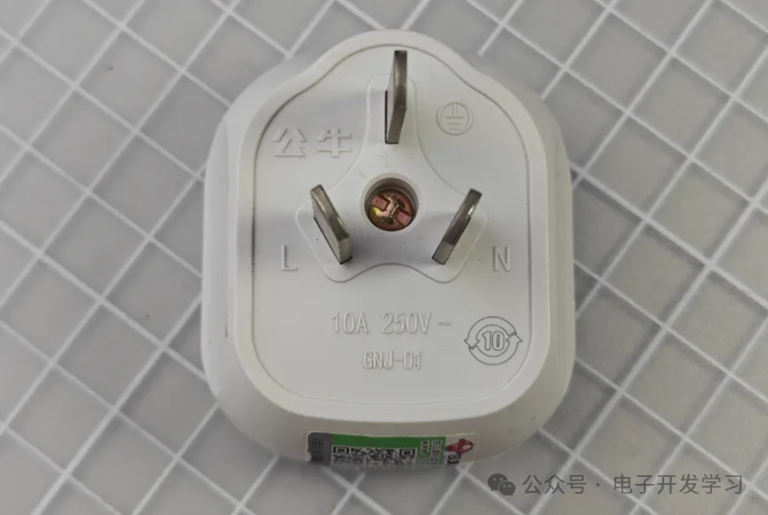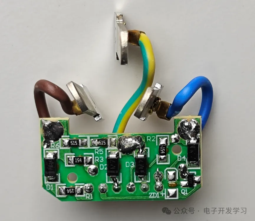 可以看出三个钢片是通过面板壳对应位置伸出的三个凸出的片顶住的。内部板子非常简单,是个单面板,背面是两个直插电阻和三个直插LED,根据丝印看,板子是21年第39周生产的。棕色的线是L,火线;蓝色的线是N,零线;黄绿色的线是E,地线。