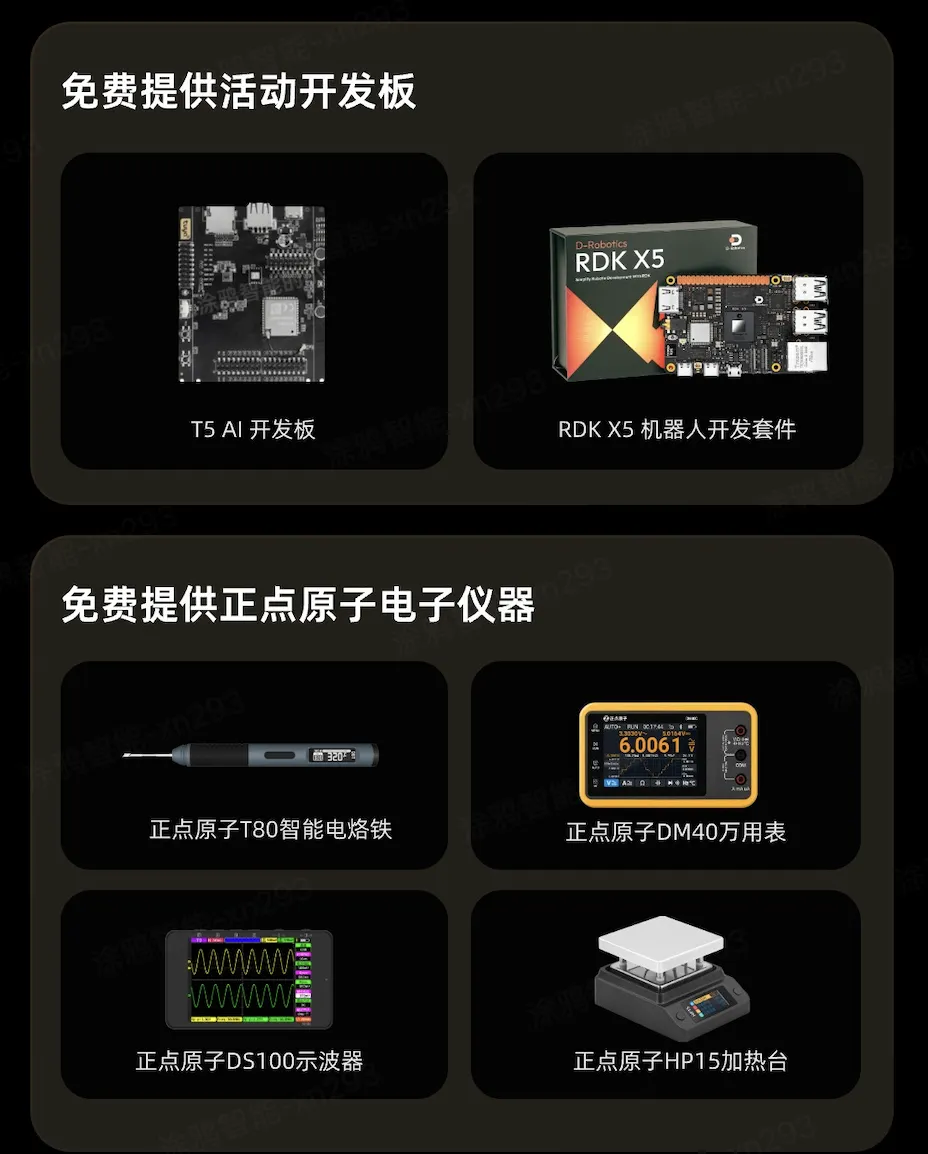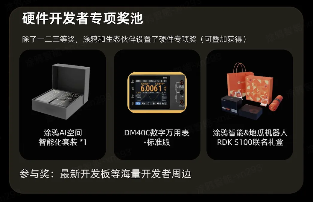 本次大赛期间,涂鸦将联合地瓜机器人免费提供 AI 硬件开发板、正点原子提供各种电子仪器,助你火力全开!