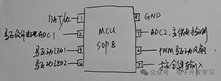 而检测驱蚊片应该是通过驱蚊片上的纽扣电池。所以这两路供电的电池电压需要检测,这就增加了2路ADC,算下来正好是6个IO口全部用完。