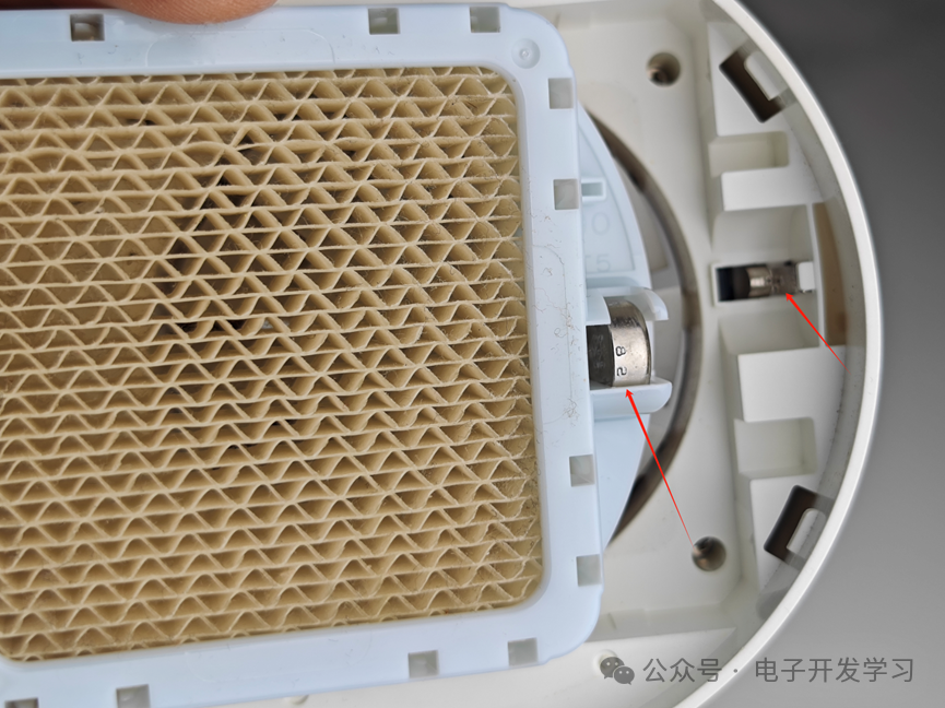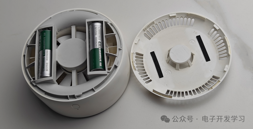 黄色的蜂巢状的片就是驱蚊片,这个买了之后也没有更换过。拆下来之后发现有点脏,但是出乎意料的是,这个驱蚊片还带了一颗纽扣电池。当把驱蚊片装进驱蚊器之后,这个电池就通过下面的金属弹片和电路板连接了。这个驱蚊片为啥需要供电?上网查了一下,说这个驱蚊片药剂中蕴含有拟除虫菊酯成分,挥发后可以有效驱蚊,那么这个纽扣电池是有助于挥发吗?