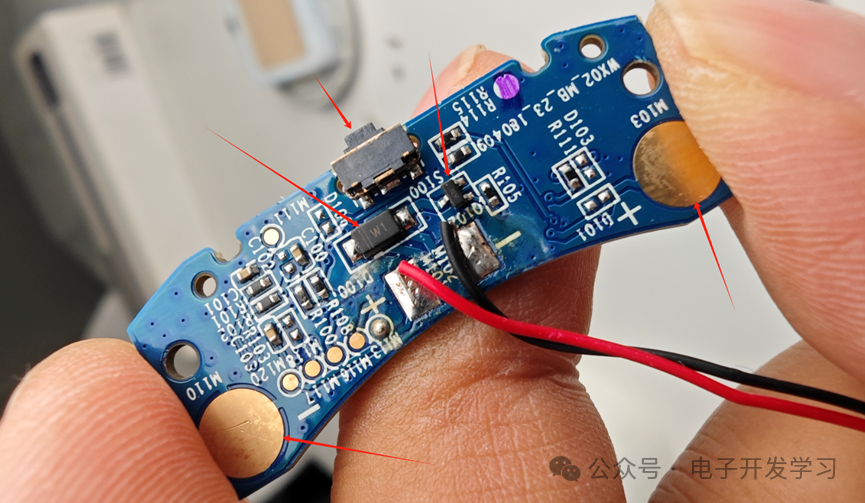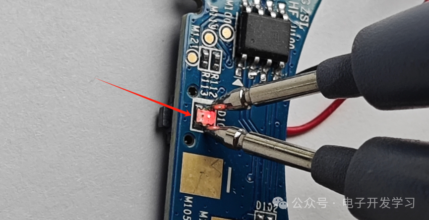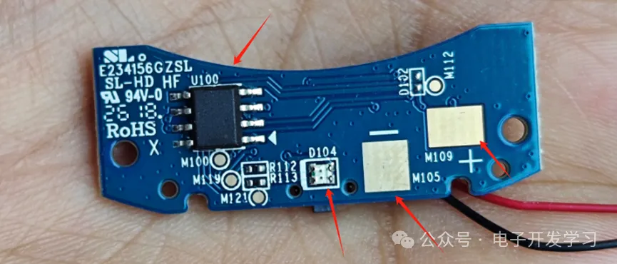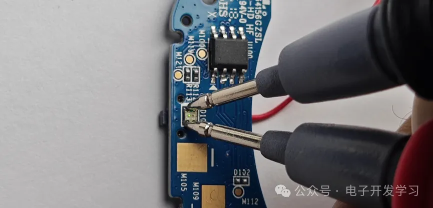板子的背面有两个矩形焊盘,这两个是通过弹片和驱蚊片的纽扣电池连接的。SOP8封装的器件应该是这个板子上的MCU,具体型号未知。另外有一颗双色LED,按照之前看的底部状态灯说明,应该是红灯和橙灯。我用万用表测量一下这两个灯的颜色