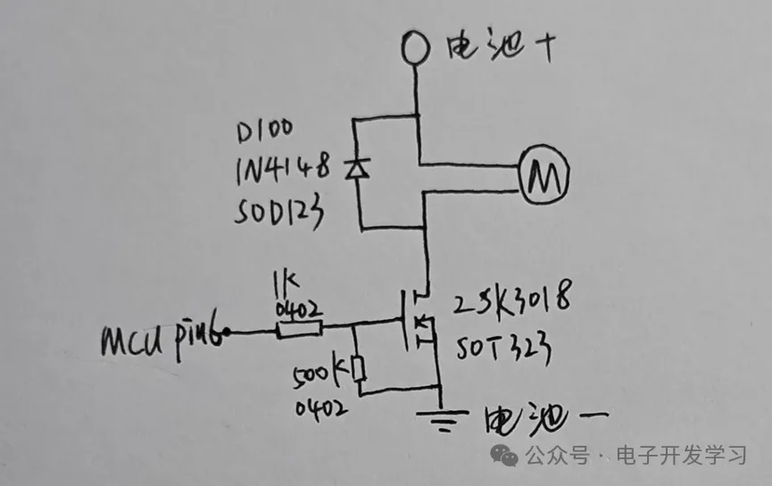 板子正面东西比较少,两个大的焊盘是用来顶在底座上的干电池触点上供电的。然后板子上还有一个SOT323的MOS管,看型号是2SK3018,另外有一个SOD123封装的二极管,其型号应该是1N4148之类的,其中MOS是作为风扇电机驱动的功率开关,由于电机属于感性器件,在MOS瞬间关断时线圈上的电路不能突变导致在MOS的D极会有很高的反向电动势,所以需要这个二极管1N4148为这个线圈提供一个回流路径,一般把这个二极管叫续流二极管。