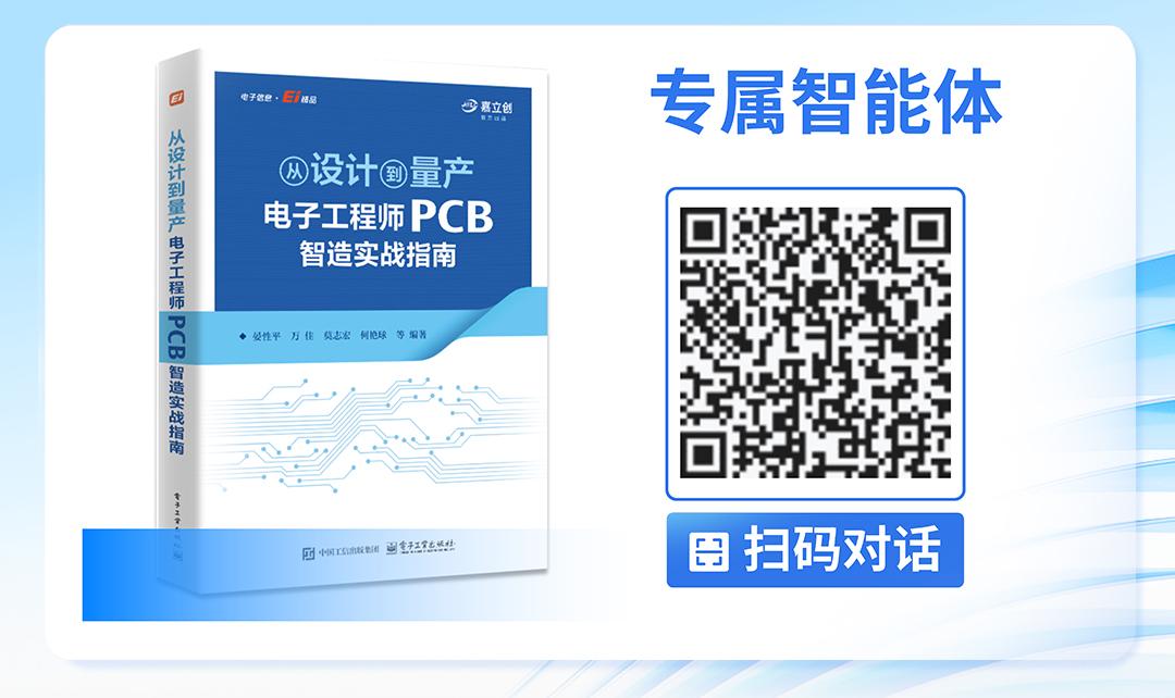 针对书籍随身携带不便的特点,本书配套智能体——PCB智造助手。通过扫描下方二维码,即可随时随地查询书中核心知识点。无论是概念不清,还是想了解嘉立创工艺细节,都能获得及时解答,实现知识随行,答疑解惑不求人。