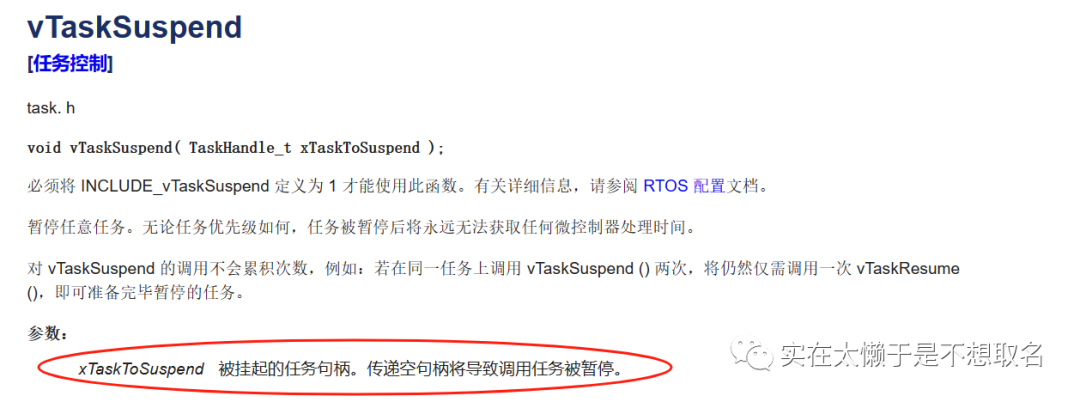 在FreeRTOS的API文档中找到任务挂起函数的介绍,函数需要的参数为我们想要挂起的任务句柄,如果传递为NULL则暂停我们的调用任务。