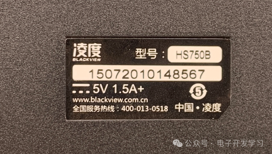 背部的铭牌上有具体的型号,凌度HS750B,供电是5V直流电。