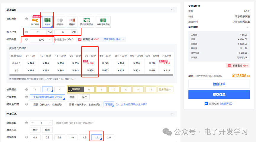 在嘉立创在线报价平台查看了一下报价。设置好板材类型、尺寸、板层厚度等。做5000片,也就是小板,总共10000个的价格是12305元,折合每片PCB的价格仅1.23元。按照嘉立创这个灵活阶梯报价,如果做的更多,价格也会更便宜。感兴趣的话可以点下面图片自己看看报价。