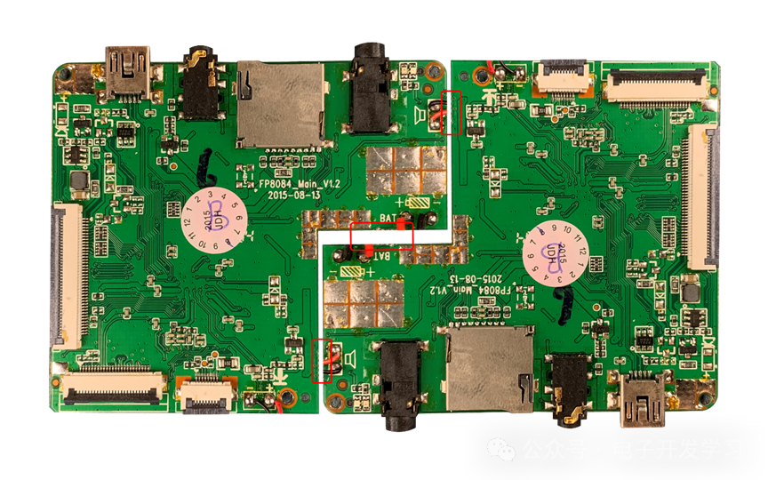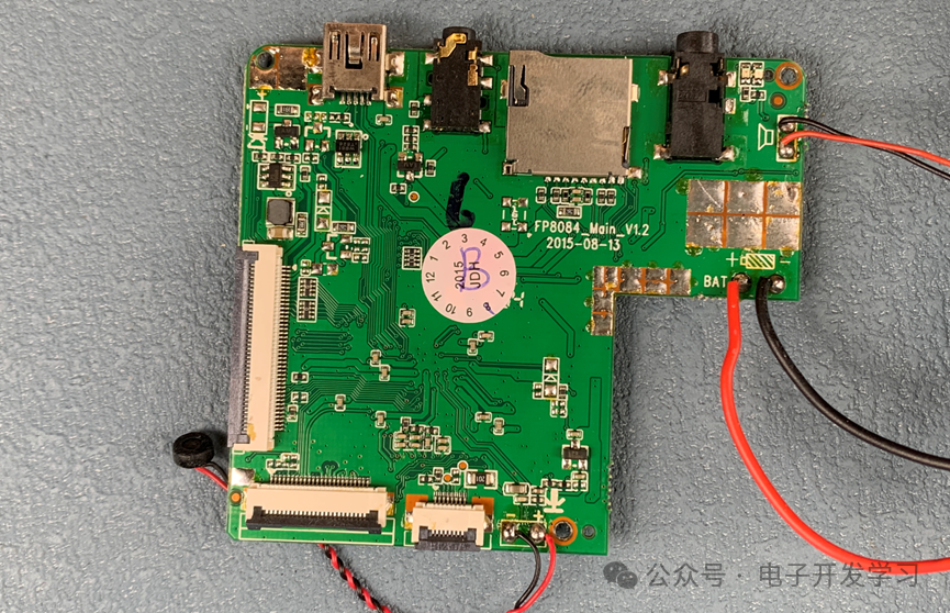 板子背面是各种连接器、TF卡插槽和LCD背光BOOST升压电路等。从出厂检验的贴纸上可以看到这个板子是2015年8月份出货的。