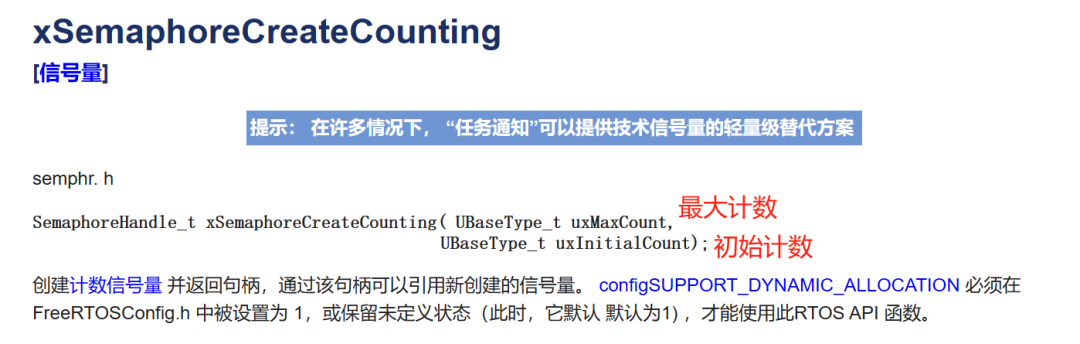 官方的参考文档中提供了两种创建方式(动态和静态)我们使用动态创建方式。调用xSemaphoreCreateCounting函数
