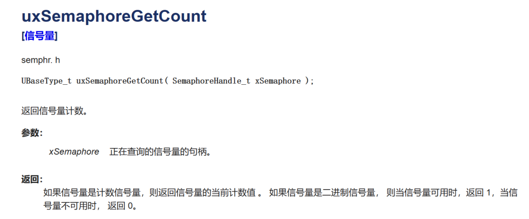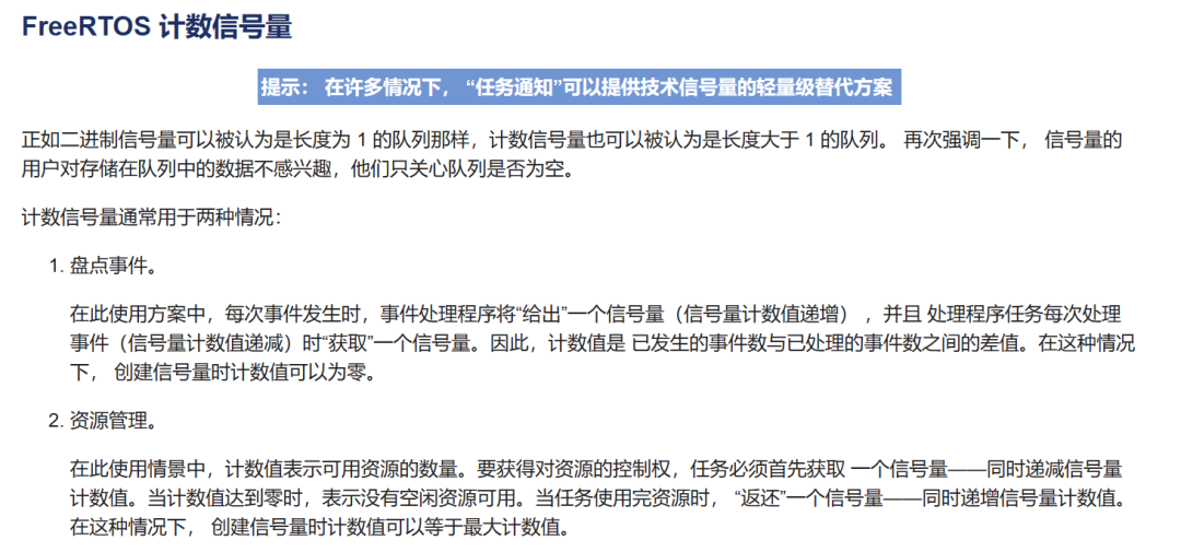 计数信号量顾名思义是用来计数的信号量,相比于二进制信号量,计数信号量的并不只有两种状态。用官方的开发者文档中的话来说,计数信号量可以看作长度大于1的队列,我们并不关心其中的内容而是关系队列是否为空。