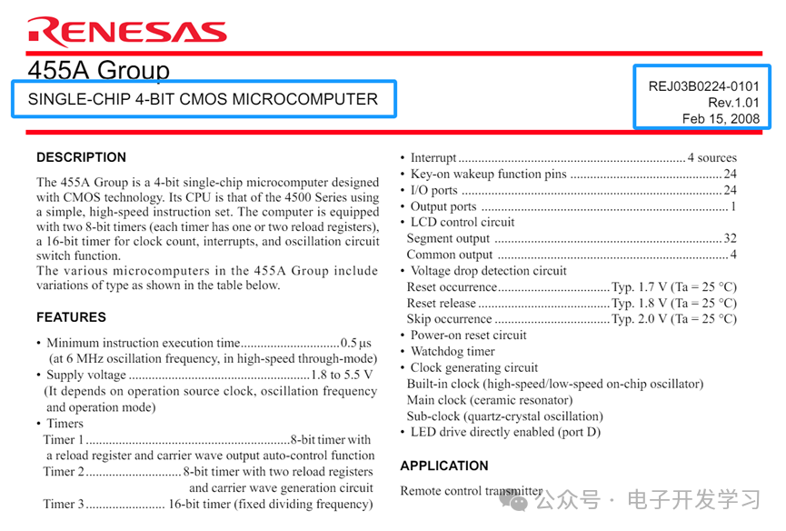 这是瑞萨的一个4-bit单片机。看这个文档发布时间是2008年,也就是说这个芯片,应该年头不短了,但是这个遥控器用到现在,没有出任何问题。甚至驱动屏幕显示正常工作了2年了,电池还有电,可见低功耗性能也不错。
