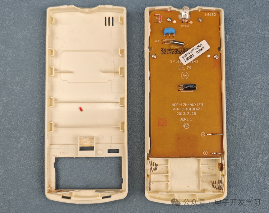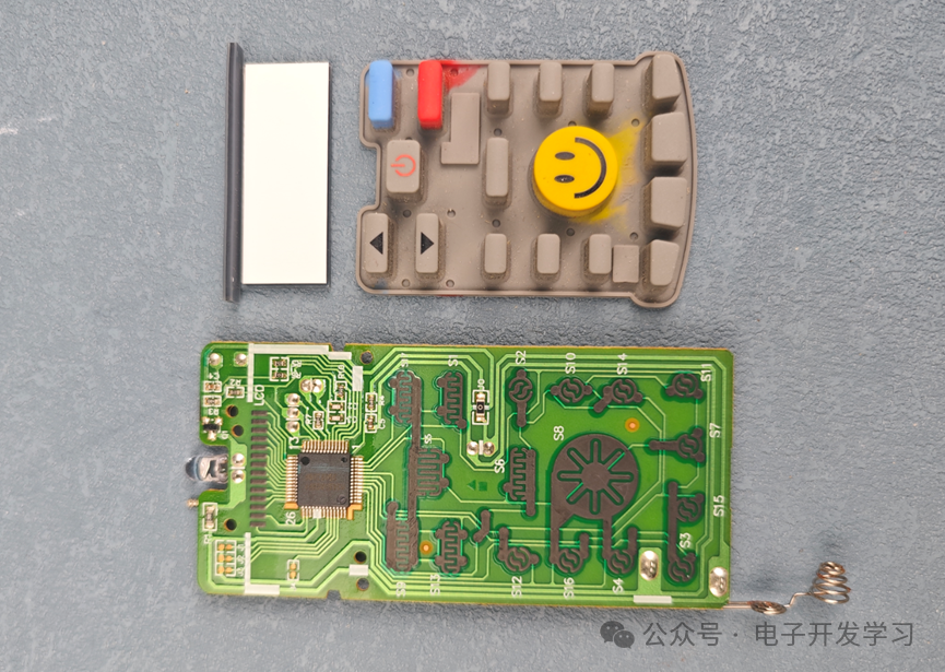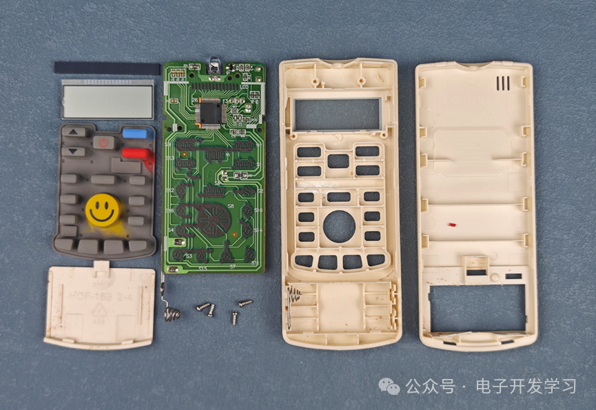 整个遥控器就这些东西,不得不说,这个空调遥控器的做工用料还是超出了我的预料。虽然PCB是单片板的,但是如果单面能搞定,也没必要费用2层板。除此之外,按键处理、MCU的选用,都是非常不错的。难怪十几年了还没有任何问题。