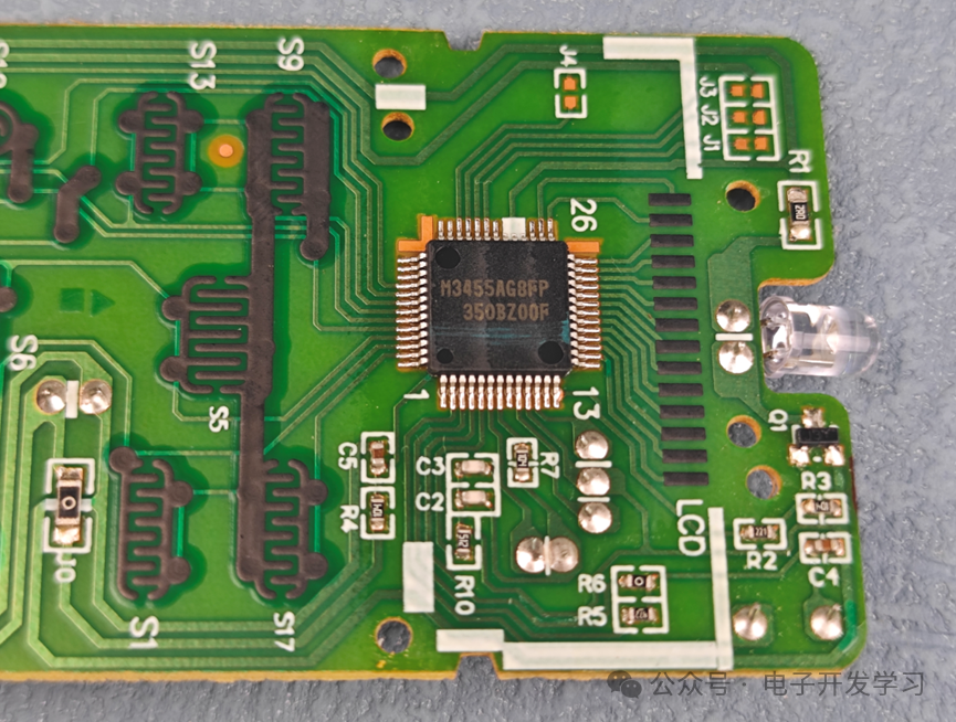 令我诧异的是,这个板子用的芯片居然不是牛屎封装,而是一个LQFP-52的芯片,丝印是M3455AG8FP。这个居然是瑞萨的一颗物料,奥克斯空调这么壕无人性吗?