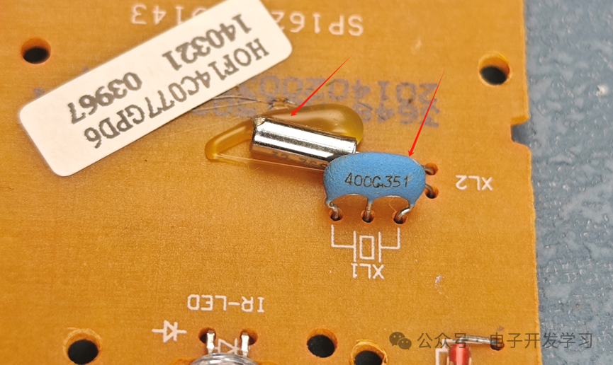 板子背面有一个柱体晶振,另外有一个三端子器件,我把它掰起来看到下面的丝印也是晶振标识,看来这个也是一个晶振。
