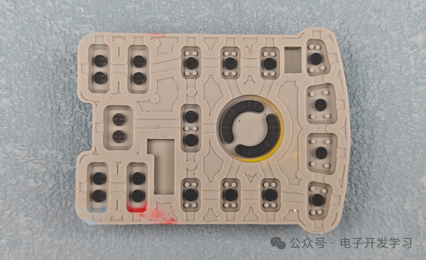 所有的按键都在这一块硅胶上面,当按键按下去之后,黑色的硅胶导电按键把碳油焊盘的两个信号短路,从而产生按键按下的信号。