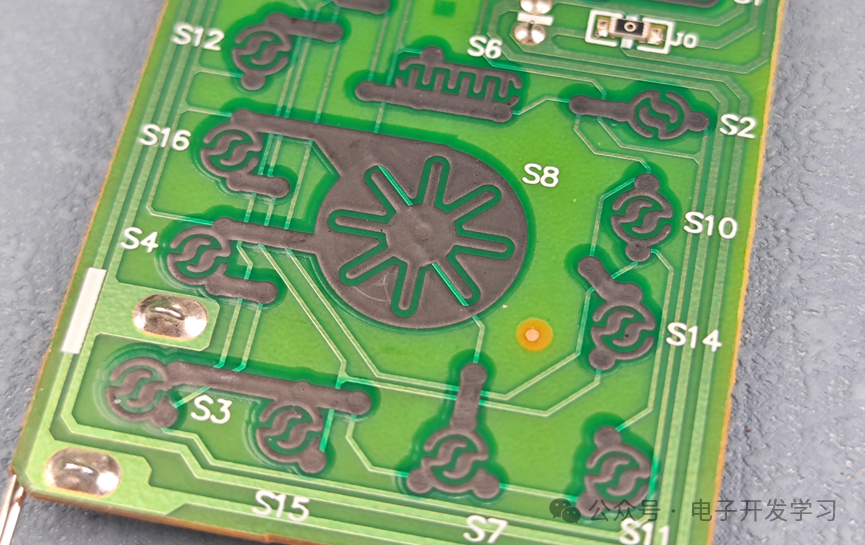 本质上就是使用碳基导电油墨在PCB的焊盘上做涂层处理。当这种导电油墨固化之后,就可以导电。使用这种工艺做按键的焊盘的两部分,当按键按下之后,这两部分通过按键上的导体短路,从而通知MCU这个按键被按下。