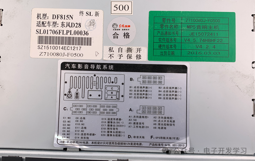 上面贴有铭牌,汽车影音导航系统。关于屁股上的连接器的信号定义,在这里有详细的说明,这个说明相当清晰明了,点赞。