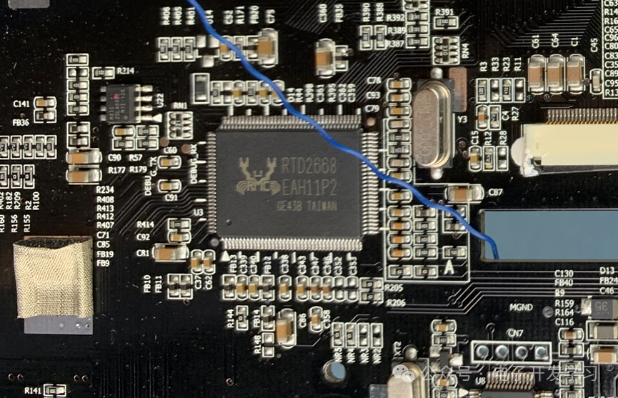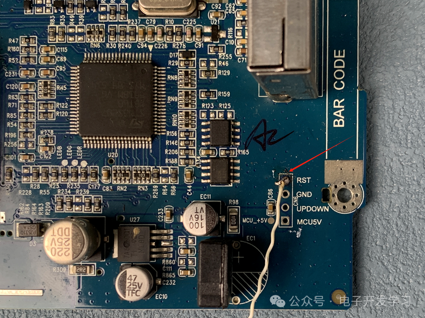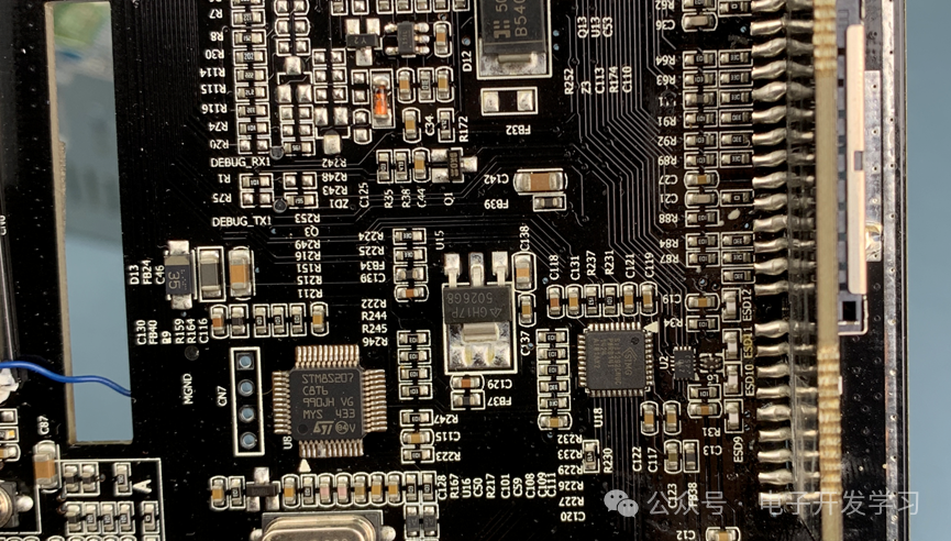 板子一个角上有一颗STM8S207,旁边有一根飞线,看样子是飞到了STM8S207的SWIM烧录口的复位RST信号上了,这应该是后续维修的时候飞的线。