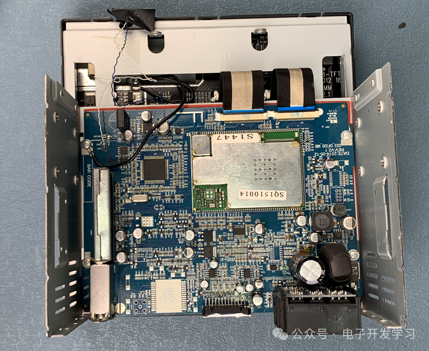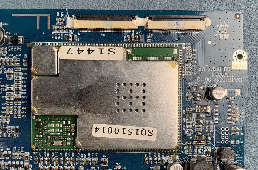 这个是多媒体处理板,采用底板加核心板的架构,核心板是带屏蔽壳的这个绿色板子,通过邮票孔和底板连接。把这个板子拆下来,看看上面用了哪些器件。