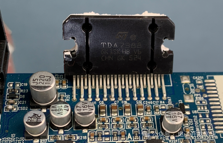边缘这个贴到外壳上散热的器件是TDA7388,这是一颗AB类音频功放,输出功率45Wx4@4Ω。
