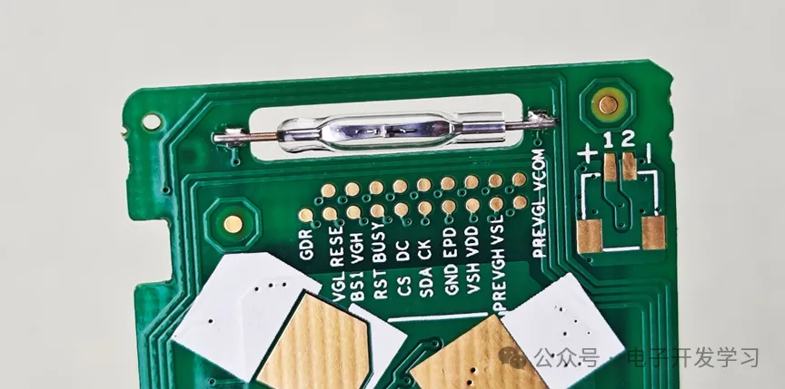 可以看到板子的右边是PCB天线。芯片下面的晶振比较好玩,3225的焊盘上焊接了一个2016的晶振。靠近板子下边缘处有一个SOP-8的焊盘没有焊接,看引脚分布和走线,应该是SPI Flash芯片的预留焊盘。板子左半边是墨水屏驱动电路。
